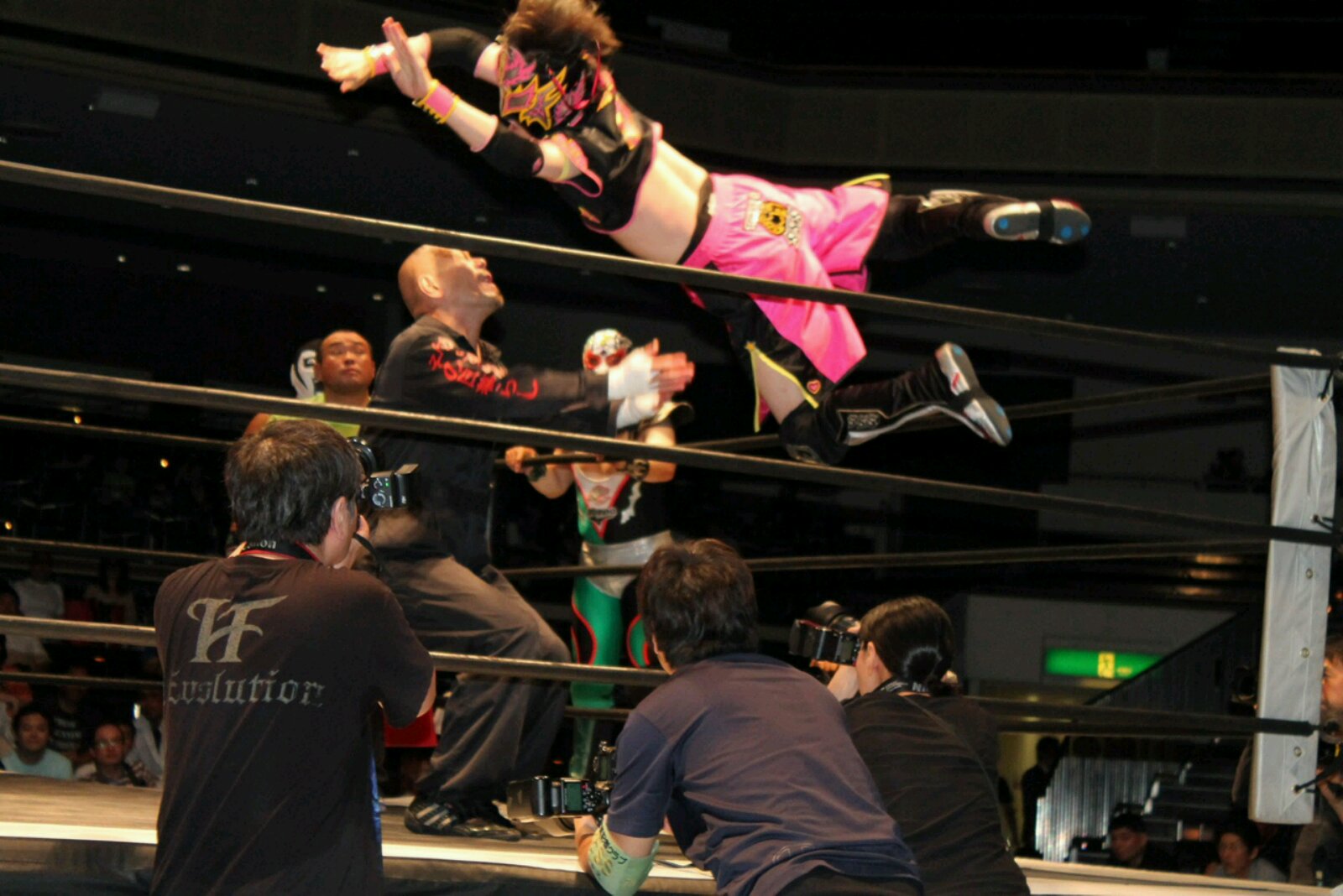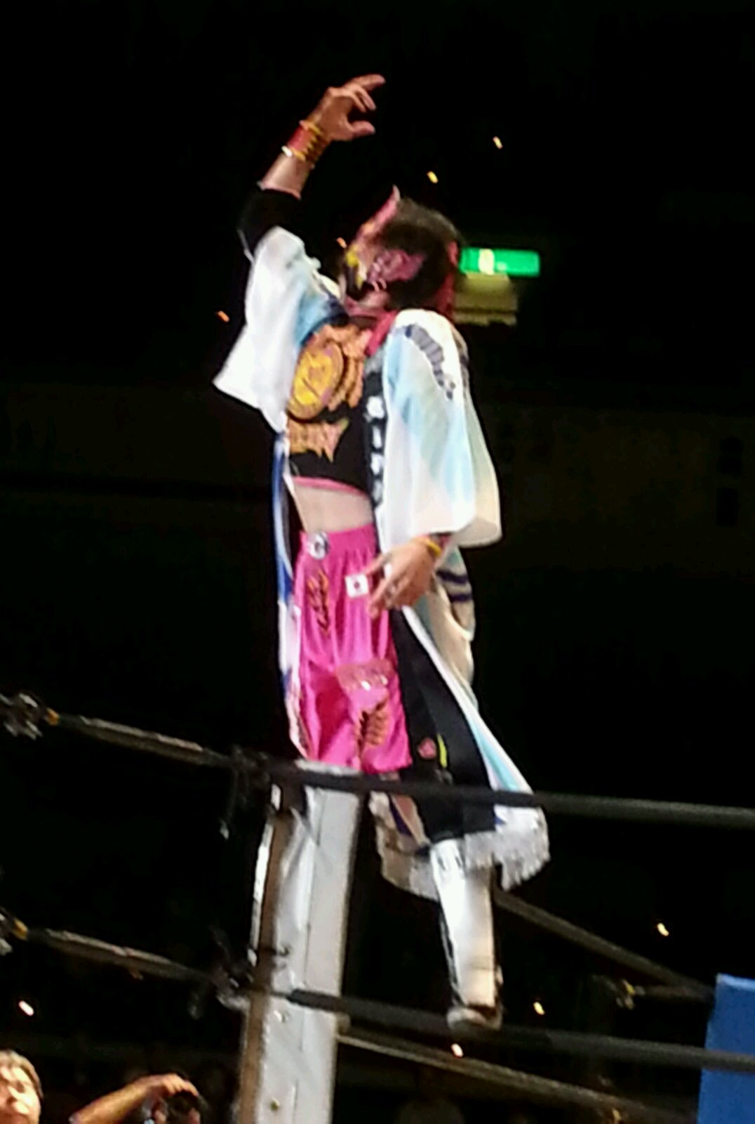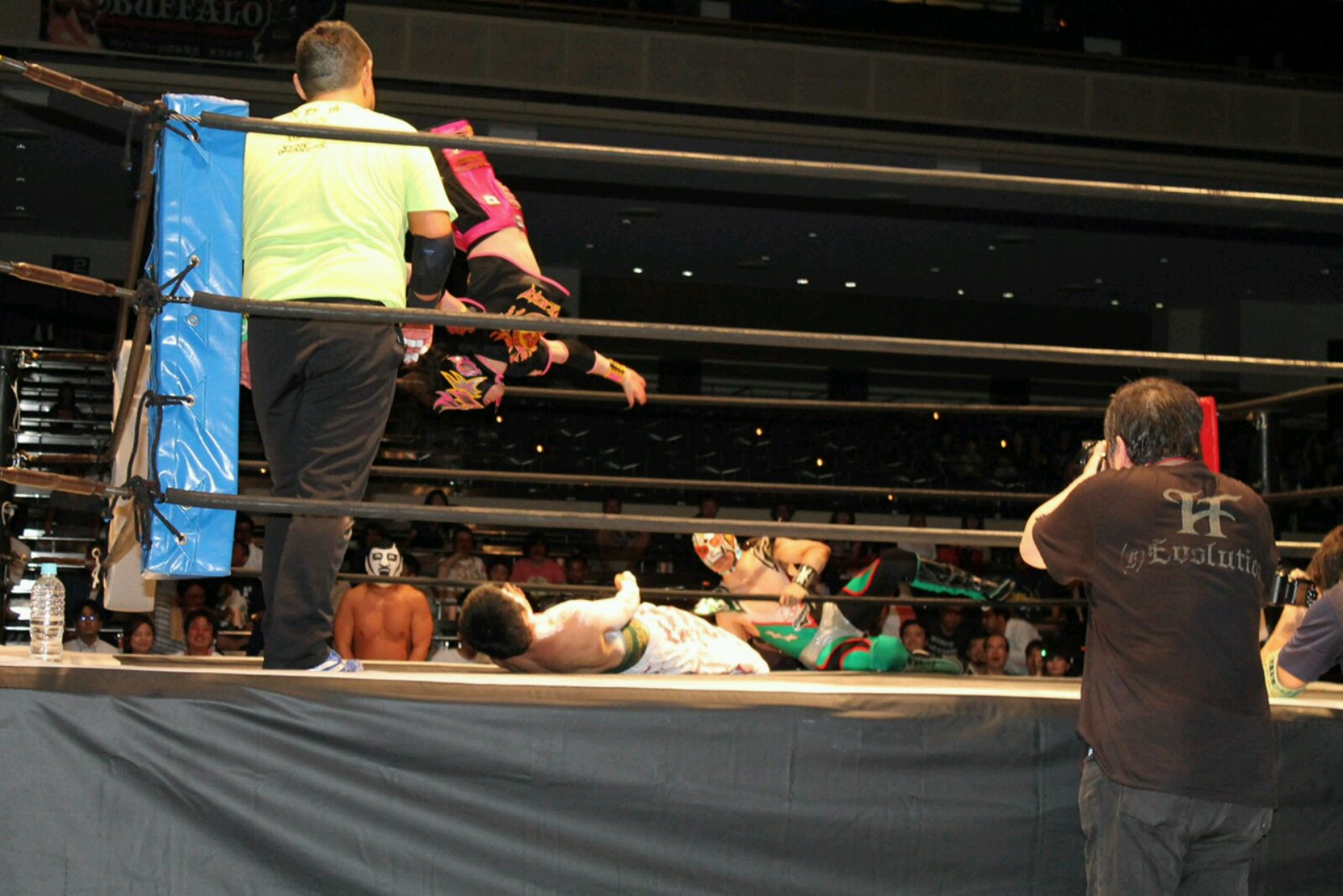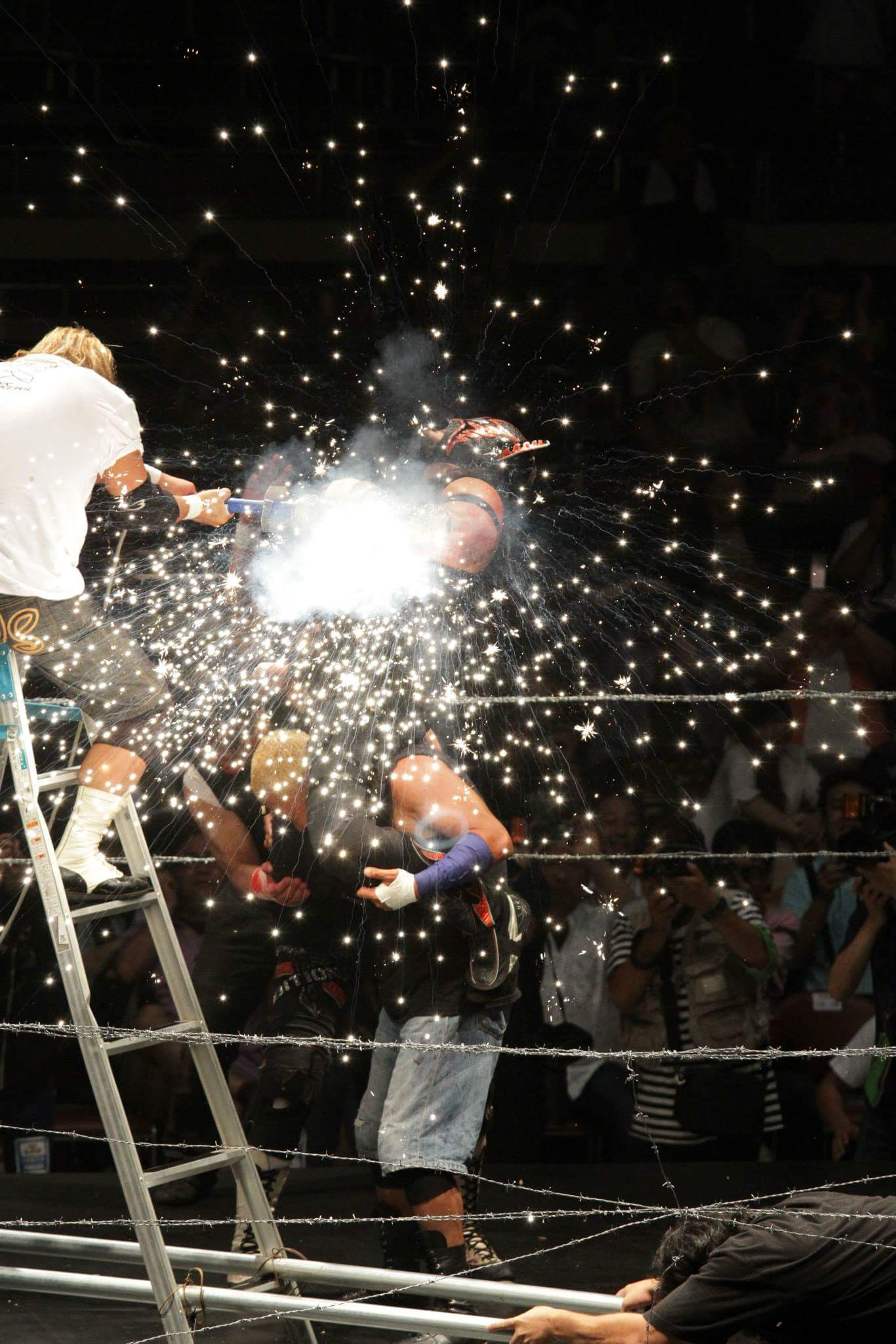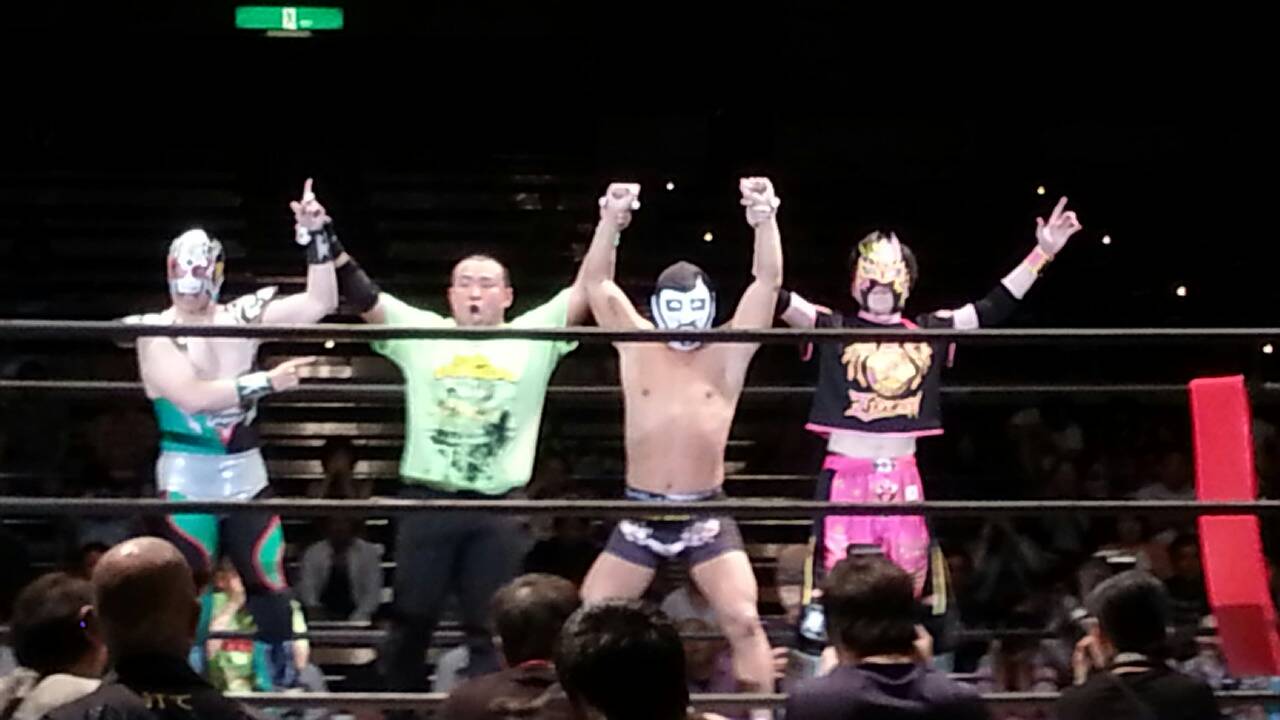 2015年7月17日(金)東京・両国国技館〈観衆:未発表〉 【 試 合 結 果 】 《16:30開始 》 ▼おっこんプロレス旗揚げ戦『いきなりメインイベント』(60分1本勝負) ザ・グレート・サスケ(みちのくプロレス)&○コマンド・ボリショイ(JWP) (12分14秒、ボリショイ式ワキ固め) “brother”YASSHI(VOODOO-MURDERS)&ライディーン鋼(JWP)● ▼BATTLE AID提供試合(10分1本勝負) ○戸井克成(BATTLE AID)&雷電(BATTLE AID)&木更津KID(BATTLE AID) (6分38秒、ダイビング・フットスタンプ→片エビ固め) GANG STAR(フリー)&TA☆KU(EAGLEプロレス)&大野翔士(EAGLEプロレス)● 《17:00開始》 ▼東海プロレス提供試合(10分1本勝負) ○脇海道弘一(東海プロレス) (5分17秒、卍固め) 両国シャドー(フリー)● 《17:15開始》 ▼佐野の恩返しマッチ 3WAYマッチ(10分1本勝負) △茂木正淑(フリー) (時間切れ引き分け) 保坂秀樹(フリー)△ 吉田和則(とちぎエンターテイメントプロレス)△ 《17:30開始》 ▼信州プロレス提供試合 第1試合(10分1本勝負) ○信州タイガーアロー(信州プロレス)&獣神サンダーライチョー(信州プロレス) (9分9秒、ダイビング・ヘッドバット→体固め) にんじゃりばんばん(信州プロレス)&THEよっちゃん。(信州プロレス)●with LINDA 第2試合(10分1本勝負) グレート☆無茶(信州プロレス)&○とらのすけ(信州プロレス) (9分9秒、ダイビング・エルボードロップ→体固め) 超獣キノッピー(信州プロレス)&チガイOKADO(信州プロレス)● 《18:00開始》 ▼プロレス系アイドルユニット無敵アイドル・ムテキど~る☆旗揚げ戦 第1試合(15分1本勝負) ○市井舞 (5分35秒、ギロチンドロップ→片エビ固め) 七里芽衣● 第2試合(15分1本勝負) ○椿さくら (11分7秒、ウラカン・ラナ→エビ固め) 市井舞● 《 本戦 18:30開始》 ▼第1試合=WALLABEE Revolution Aniversario2015 ワラビー世界マーシャル・アーツ選手権試合(61分1本勝負) ○<王者>矢野啓太(プロレス佐野魂/プロフェッショナル・レスリング・ワラビー) (3分19秒、みちのくドライバーII→片エビ固め) 三州ツバ吉(BUMPMAN)<挑戦者>● ※初代王者・矢野が8度目の防衛に成功 ▼第2試合=奥田朱理復帰戦 ミックスドマッチ(30分1本勝負) 奥田朱理(フリー)&○Hi 69(フリー)&榎本陽介(アパッチプロレス軍) (11分15秒、ストゥーカ・スプラッシュ→片エビ固め) 橋本友彦(アパッチプロレス軍)●&HASEGAWA(アパッチプロレス軍)&飯田美花(プロレスリングWAVE) ▼第3試合=6人タッグマッチ(30分1本勝負) ○スペル・デルフィン(沖縄プロレス)&あいつ(PUNK DRUNKERS)&ZIPANGU(プロレス佐野魂/PRO-WRESTLING SSS) (7分40秒、デルフィンクラッチ) 新井健一郎(DRAGON GATE)&翔太(プレス佐野魂/ガッツワールド)&小仲=ペールワン(プロレス佐野魂/666/プロレス実験団GUYZ)● ▼第4試合=ピンクタイガー総帥引退記念試合(30分1本勝負) ○嵐(天龍プロジェクト)&ヒロ斎藤(ドラディション) (7分55秒、パワーボム→エビ固め) ピンクタイガー総帥(プロレス佐野魂)●&黒田哲広(アパッチプロレス軍) ▼第5試合=1vs4ハンディキャップマッチ(30分1本勝負) ○曙(全日本プロレス) (8分13秒、ボディプレス→体固め) よしえつねお(フリー)●&ガッツ中村(プロレス佐野魂)&園山檸檬(フリー)&タケシマケンヂ(スポルティーバエンターテイメント) ▼第6試合=CPEキャットファイトPresents どきッ!【一夜限り】女だらけの競泳キャットファイトバトルロイヤル(30分1本勝負) ○さちこYokozuna (5分59秒 エビ固め) ラ・マルクリアーダ● ※さちこYokozunaが優勝 退場順:白玉あも→タイガー愛子→ティロ・フィナーレ加川 with ももえり→平井さん→鳳華→羽柴まゆみ→若林美保→範田紗々 with 三代目葵マリー&今西愛&新垣愛菜→シバター→ラ・マルクリアーダ with 夢月姫乃&みでぃ&樹本ふわり ▼セミファイナル=世界最高峰のハードコアマッチ(時間無制限1本勝負) ○田中将斗(プロレスリングZERO1) (10分29秒、スライディングD→片エビ固め) 金村キンタロー(アパッチプロレス軍)● ▼メインイベント=史上初!両国国技館 ノーロープ有刺鉄線ストリートファイト電流爆破バット6人タッグデスマッチ(時間無制限1本勝負) 大仁田厚(フリー)&○佐野直(プロレス佐野魂)&千葉智紹(プロレス佐野魂) (10分14秒、電流爆破バット攻撃→体固め) KENSO(全日本プロレス)&バッファロー(先駆舎)●&二瓶一将(喧嘩プロレス二瓶組) |